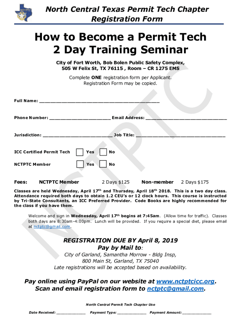 North Central Texas Permit Tech Chapter Registration Form to Become a Permit Tech 2-Day Training Seminar City of Fort Worth, Bob Bowen Public Safety Complex, 505 W Felix St, TX 76115, Room CR 1275