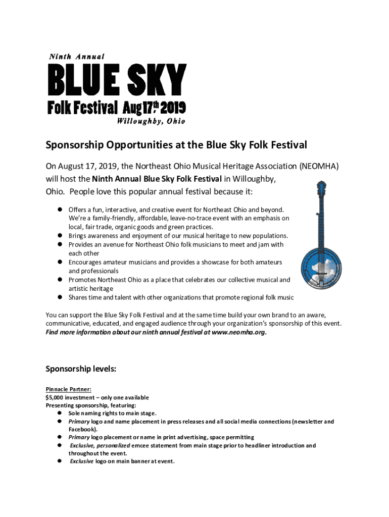 Sponsorship Opportunities at the Blue Sky Folk Festival On August 17, 2019, the Northeast Ohio Musical Heritage Association (NEVADA) will host the Ninth Annual Blue Sky Folk Festival in Willougbhy,