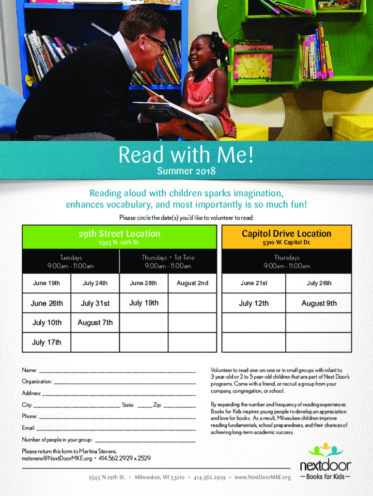 Read with Me! Summer 2018Reading aloud with children sparks imagination, enhances vocabulary, and most importantly is so much fun! Please circle the date(s) you'd like to volunteer to read:29th Street