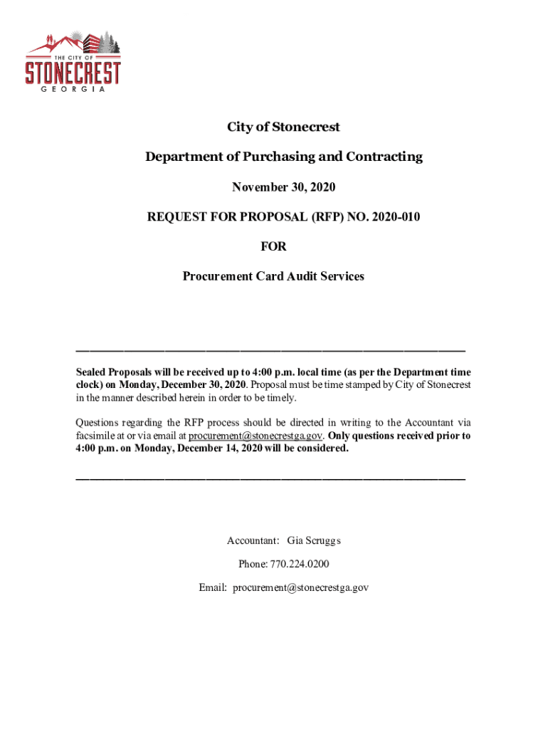 City of Stone crest Department of Purchasing and Contracting November 30, 2020, REQUEST FOR PROPOSAL (RFP) NO. 2020010 FOR Procurement Card Audit Services Sealed Proposals will be received up to 4:00