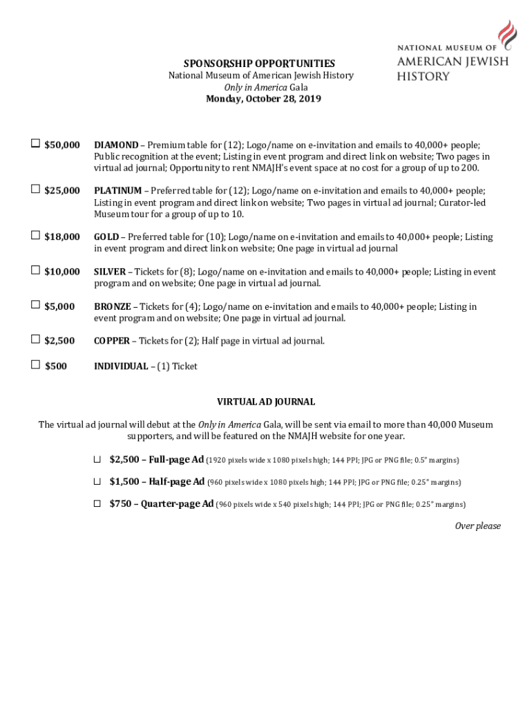 SPONSORSHIP OPPORTUNITIESNational Museum of American Jewish History Only in America Gala Monday, October 28, $201950,000DIAMOND Premium table for (12); Logo/name one invitation and emails to 40,000+