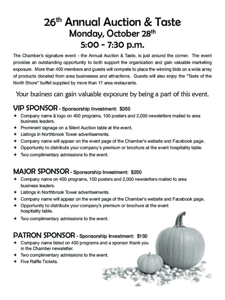 26th Annual Auction & Taste Monday, October 28th 5:00 7:30 p.m. The Chambers signature event the Annual Auction & Taste, is just around the corner. The event provides an outstanding opportunity to