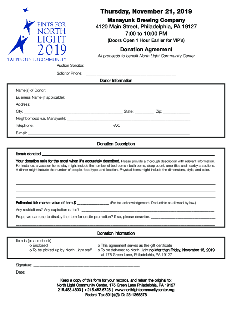 Thursday, November 21, 2019, Managing Brewing Company 4120 Main Street, Philadelphia, PA 19127 7:00 to 10:00 PM (Doors Open 1 Hour Earlier for VIPs)Donation Agreement All proceeds to benefit North