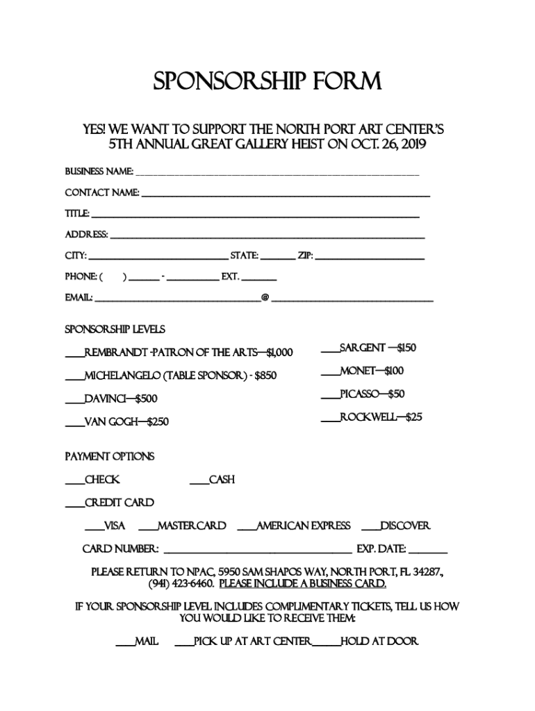 Sponsorship Form YES! We want to support the North Port Art Centers 5th annual Great Gallery Heist on Oct. 26, 2019 Business Name: Contact Name: Title: Address: City: State: Zip: Phone: () Ext. Email: