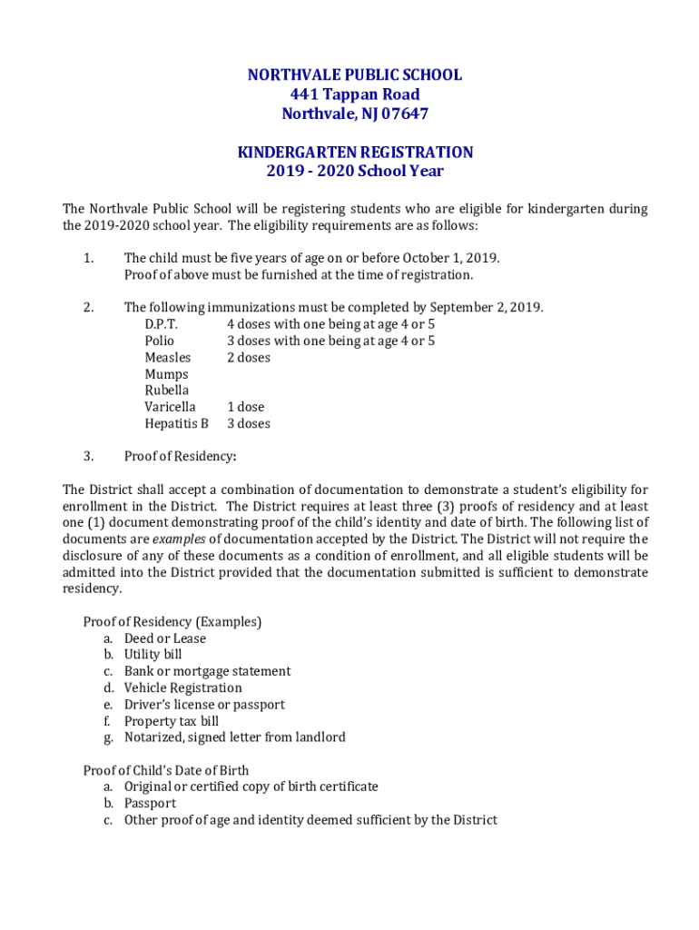 NORTHVILLE PUBLIC SCHOOL441 Tap pan RoadNorthvale, NJ 07647KINDERGARTEN REGISTRATION2019 2020 School YearTheNorthvalePublicSchoolwillberegisteringstudentswhoareeligibleforkindergartenduringthe 20192020