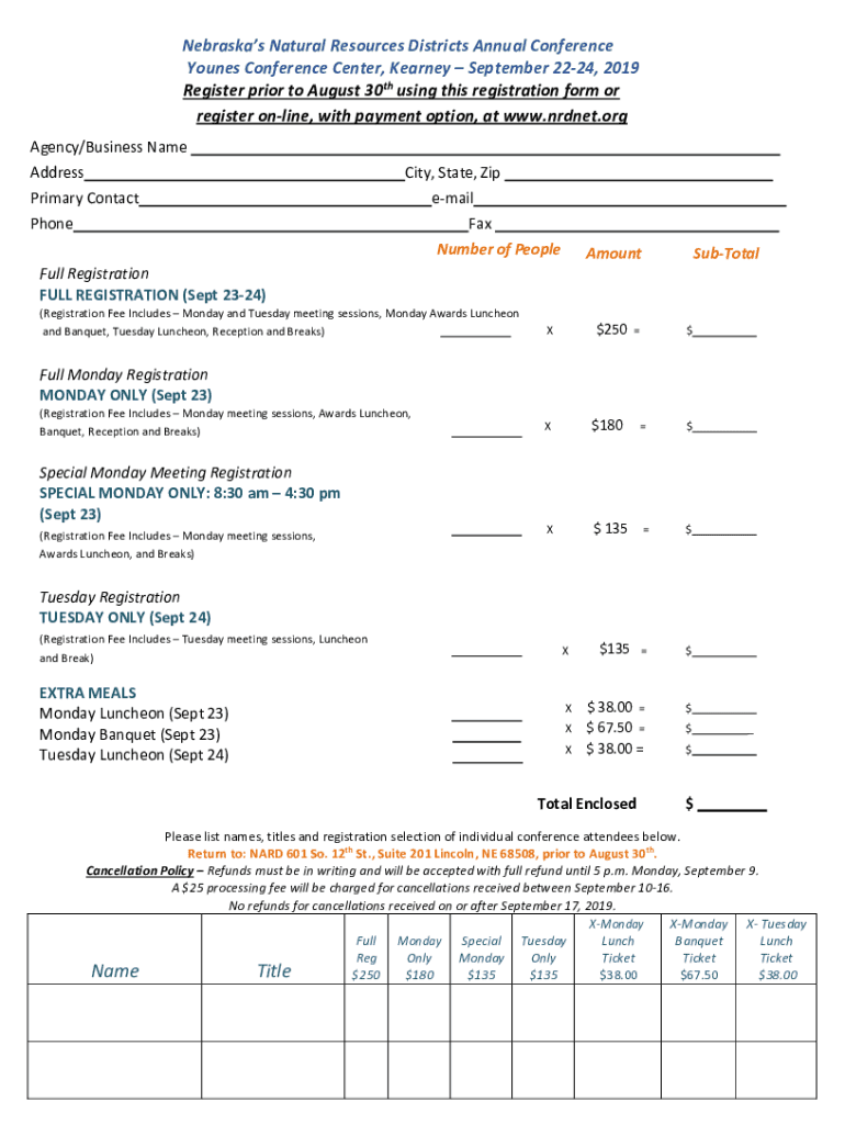 Nebraska's Natural Resources Districts Annual Conference Houses Conference Center, Kearney September 2224, 2019 Register prior to August 30th using this registration form or register online, with