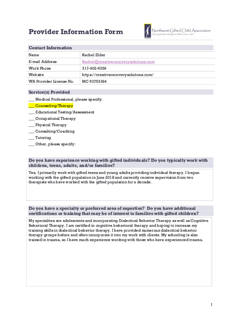 Provider Information Form Contact Information Name Rachel ElderEmail Address Rachel creativerecoverysolutions. Comfort Phone3179026359Websitehttps://creativerecoverysolutions.com/WA Provider License