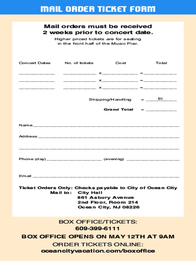 Mail Order Ticket Form Mail orders must be received 2 weeks prior to concert date. Higher priced tickets are for seating in the front half of the Music Pier. Concert Dates No. Of tickets Postnatal