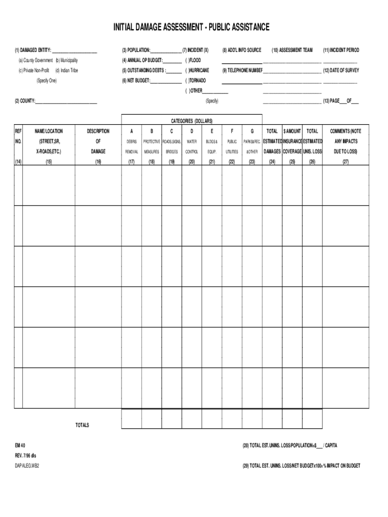 INITIAL DAMAGE ASSESSMENT PUBLIC ASSISTANCE (1) DAMAGED ENTITY: (3) POPULATION: (7) INCIDENT (X)(a) County Government (b) Municipality(4) ANNUAL OP BUDGET: ()FLOOD(c) Private Nonprofit(5) OUTSTANDING