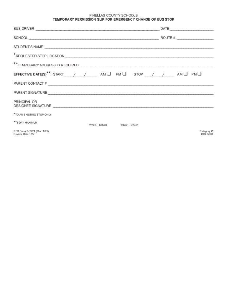 PINELLAS COUNTY SCHOOLS TEMPORARY PERMISSION SLIP FOR EMERGENCY CHANGE OF BUS STOP BUS DRIVER DATE SCHOOL ROUTE # STUDENTS NAME *REQUESTED STOP LOCATION **TEMPORARY ADDRESS IS REQUIRED EFFECTIVE DATE(S)**: