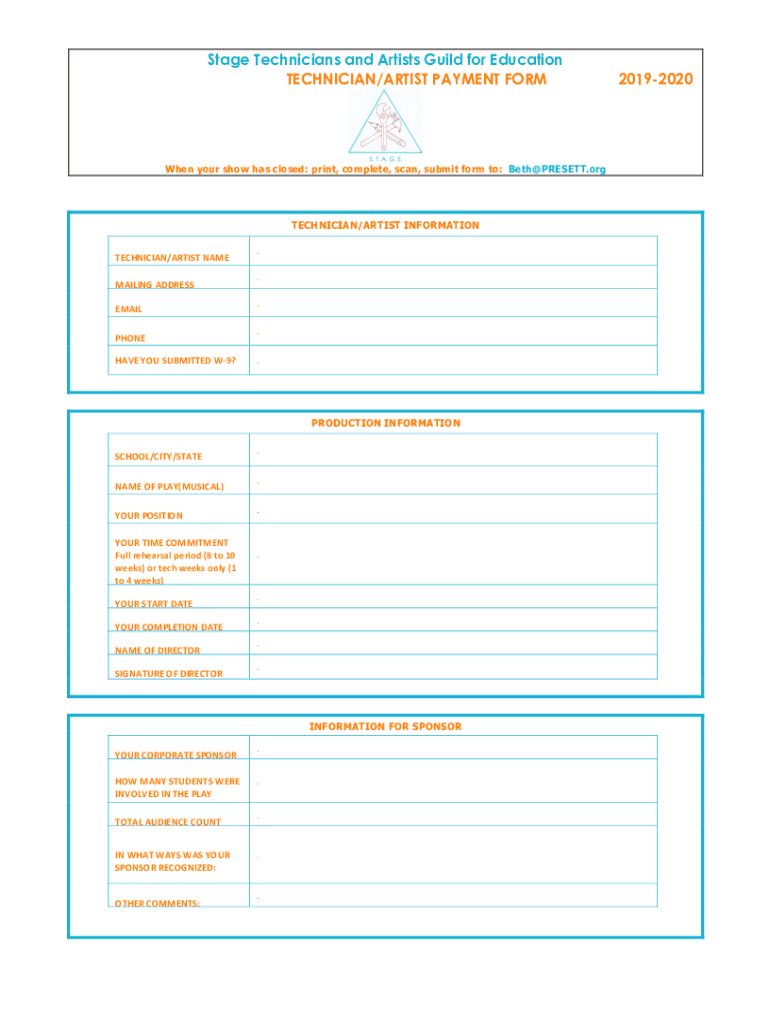 TECHNICIAN/ARTIST PAYMENT Former your show has closed: print, complete, scan, submit form to: Beth@PRESETT.orgTECHNICIAN/ARTIST INFORMATION