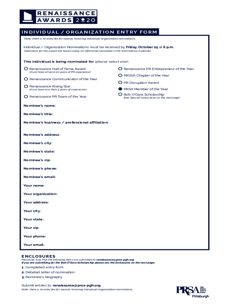 *Note, there is no entry fee for awards honoring individual/organization nominations. Individual / Organization Nominations must be received