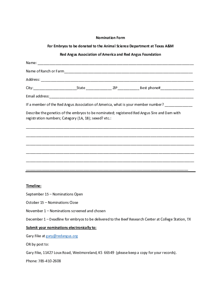 Nomination Form For Embryos to be donated to the Animal Science Department at Texas A&M Red Angus Association of America and Red Angus Foundation Name: Name of Ranch or Farm Address: City: State ZIP