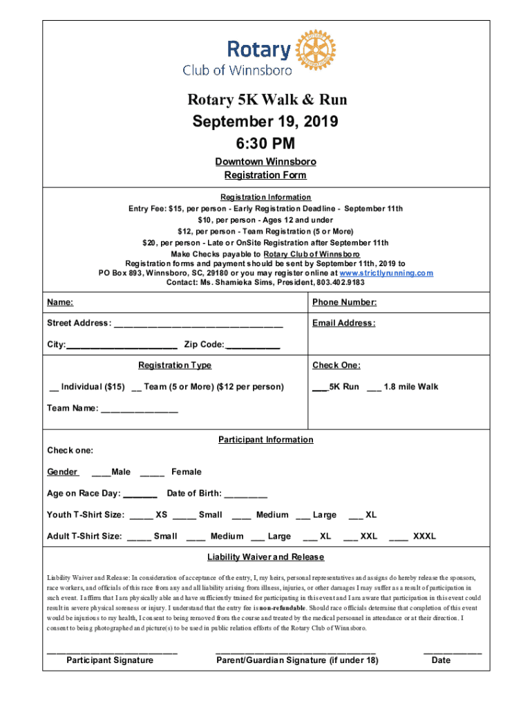 Rotary5K Walk & Run September 19, 2019 6:30 PM Downtown Winnsboro Registration Preregistration Information Entry Fee: $15, per person Early Registration Deadline September 11th $10, per person Ages
