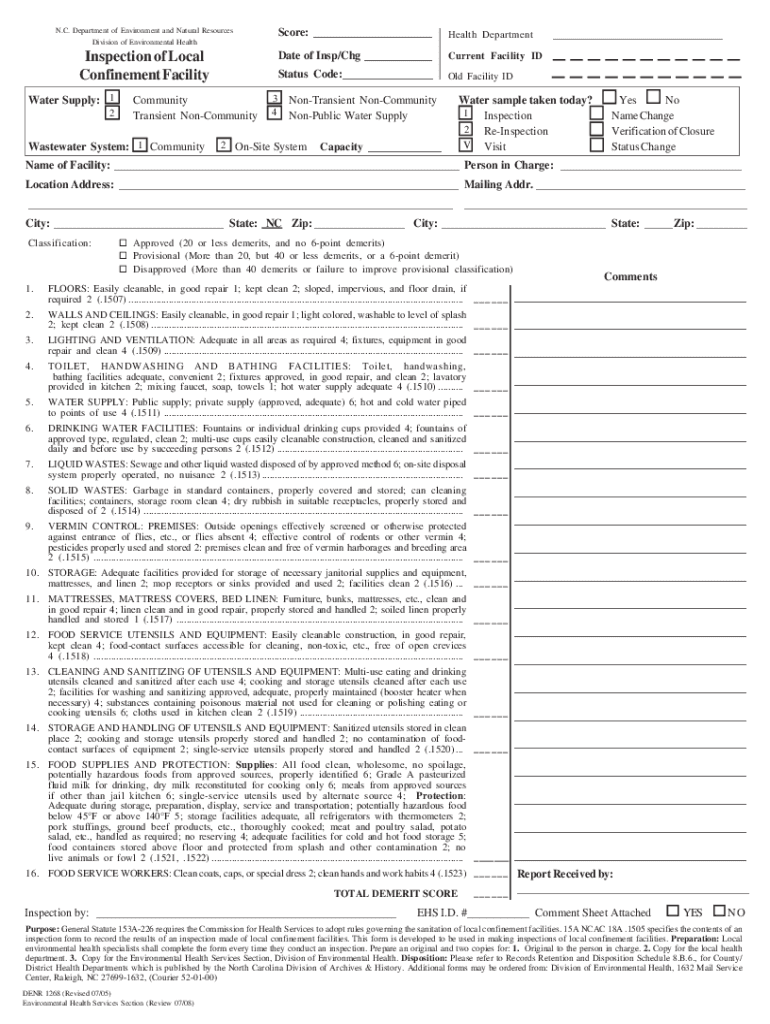 N.C. Department of Environment and Natural Resources Division of Environmental HealthInspection of Local Confinement Facility Water Supply: 1 2Community Transient NonCommunityWastewater System: 1