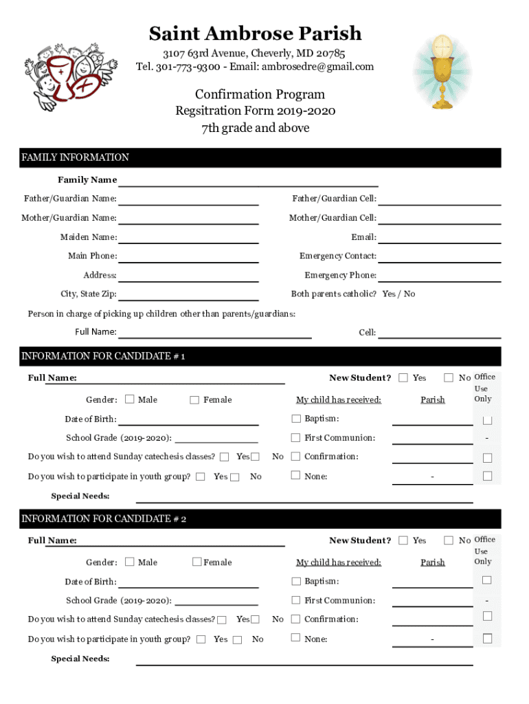 Saint Ambrose Parish 3107 63rd Avenue, Cleverly, MD 20785 Tel. 3017739300 Email: Ambrose Gmail. Confirmation Program Registration Form 20192020 7th grade and above FAMILY INFORMATION Family Name Father/Guardian