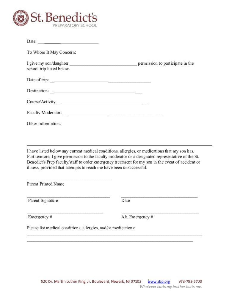 Date: To Whom It May Concern: I give my son/daughter permission to participate in the school trip listed below. Date of trip: Destination: Course/Activity Faculty Moderator: Other Information:I have