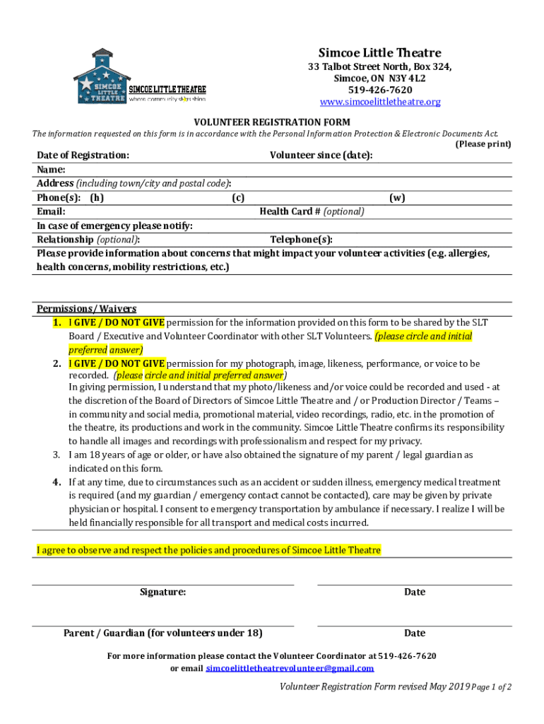 Since Little Theater 33 Talbot Street North, Box 324, Since, ON N3Y 4L2 5194267620 www.simcoelittletheatre.org VOLUNTEER REGISTRATION From The information requested on this form is in accordance with