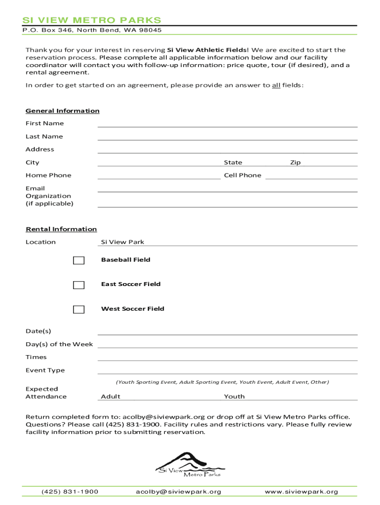 P.O. Box 346, North Bend, WA 98045Thank you for your interest in reserving Si View Athletic Fields! We are excited to start the