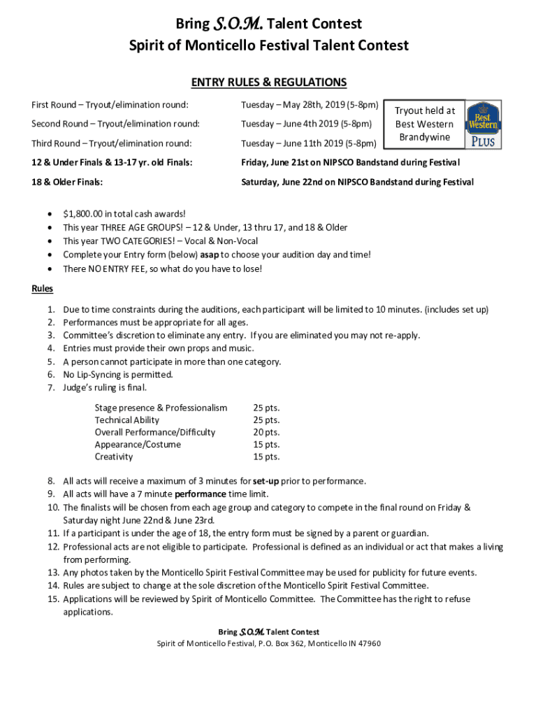 Bring S.O.M. Talent Contest Spirit of Monticello Festival Talent Contest ENTRY RULES & REGULATIONS First Round Tryout/elimination round:Tuesday, May 28th, 2019 (58pm)Second Round Tryout/elimination