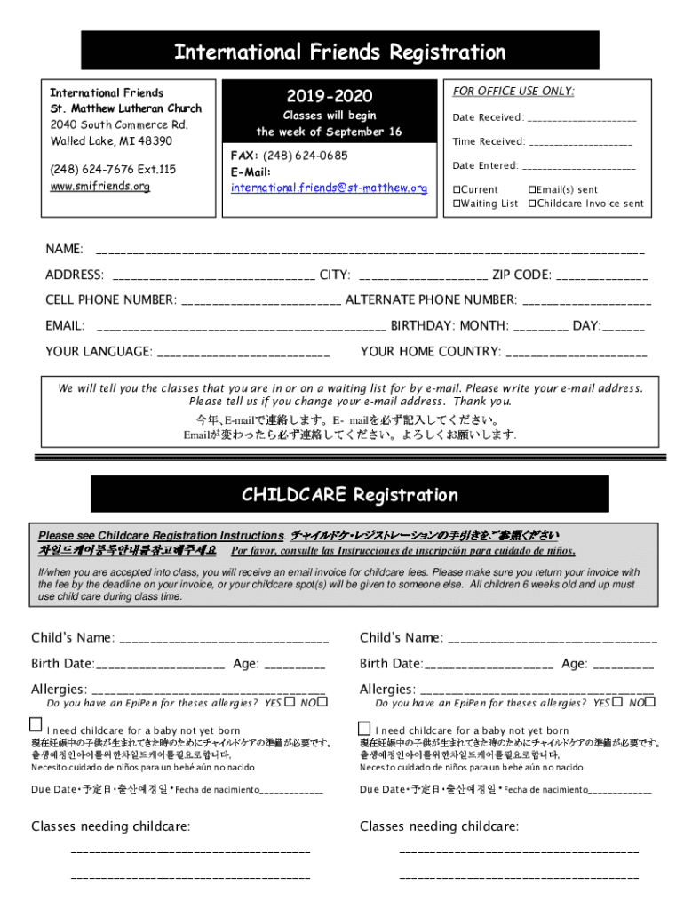International Friends Registration International Friends St. Matthew Lutheran Church 2040 South Commerce Rd. Walled Lake, MI 48390FOR OFFICE USE ONLY:20192020 Classes will begin the week of September