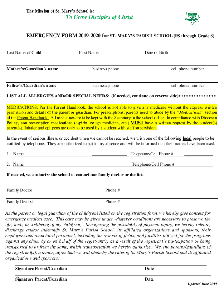 The Mission of St. Mary's School is:To Grow Disciples of Christ EMERGENCY FORM 20192020 for ST. MARY PARISH SCHOOL (PS through Grade 8) Last Name of Childbirth Name Date of BirthMothers/Guardians
