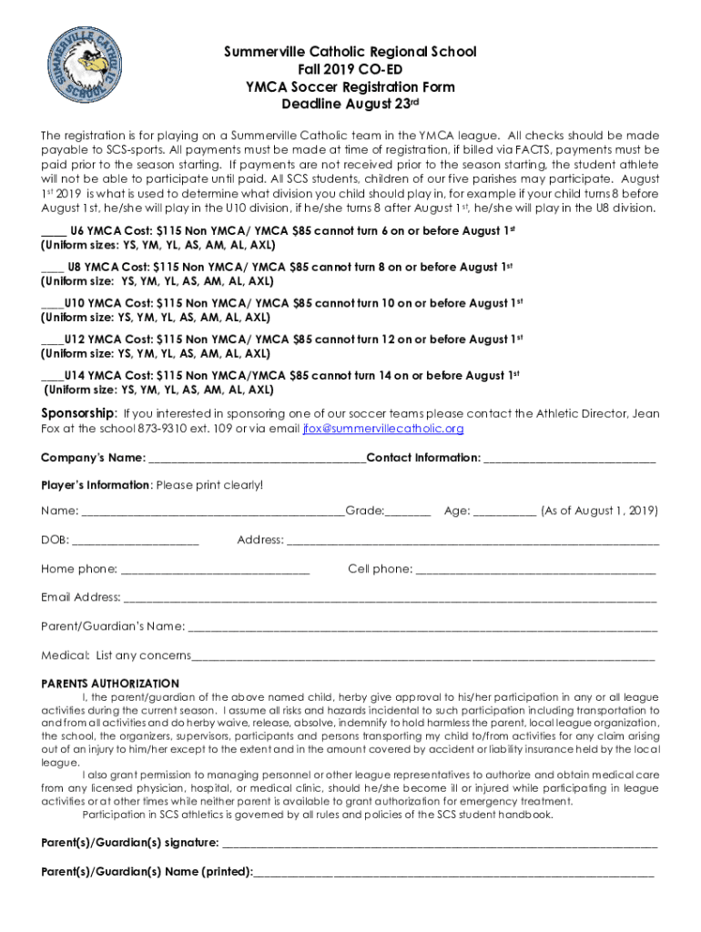 The registration is for playing on a Summerville Catholic team in the YMCA league. All checks