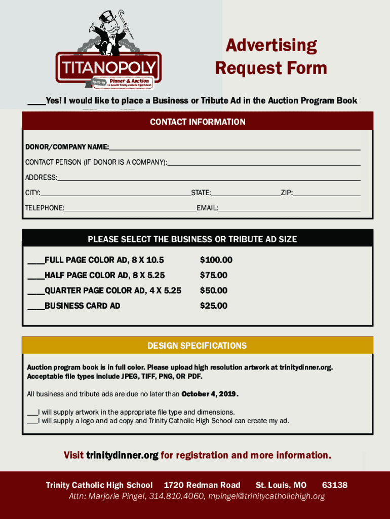 101919Advertising Request Forerunner & Auction to benefit Trinity Catholic High School Yes! I would like to place a Business or Tribute Ad in the Auction Program Book CONTACT INFORMATION DONOR/COMPANY
