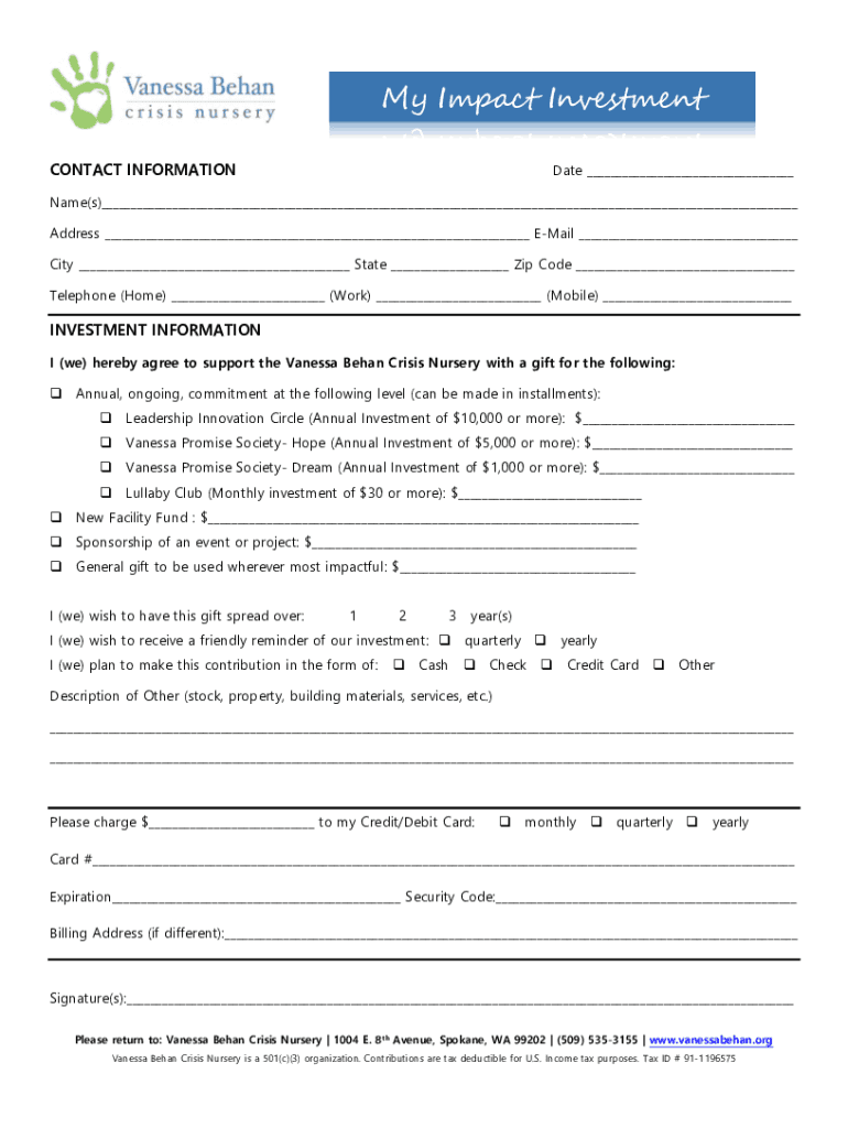 My Impact Investment CONTACT Informational Name(s) Address Email City State Zip Code Telephone (Home) (Work) (Mobile) INVESTMENT INFORMATION I (we) hereby agree to support the Vanessa Behan Crisis