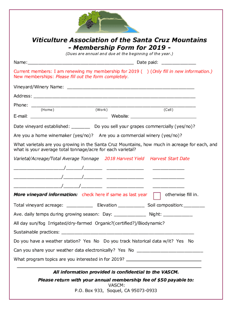 Viticulture Association of the Santa Cruz Mountains Membership Form for 2019 (Dues are annual and due at the beginning of the year.) Name: Date paid: Current members: I am renewing my membership for