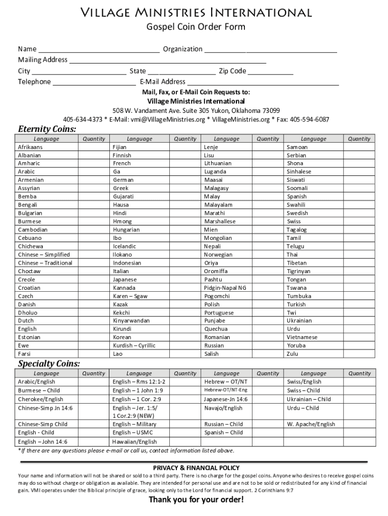 Village Ministries International GospelCoinOrderForm Name Organization MailingAddress City State Opcode Telephone Misaddress Mail, Fax, orEMailCoinRequeststo:VillageMinistriesInternational 508W. VandamentAve.