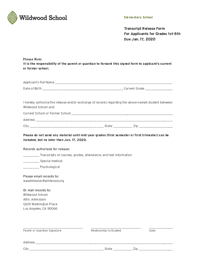 Elementary SchoolTranscript Release Form For Applicants for Grades 1st5th Due Jan. 17, 2020Please Note: It is the responsibility of the parent or guardian to forward this signed form to applicants