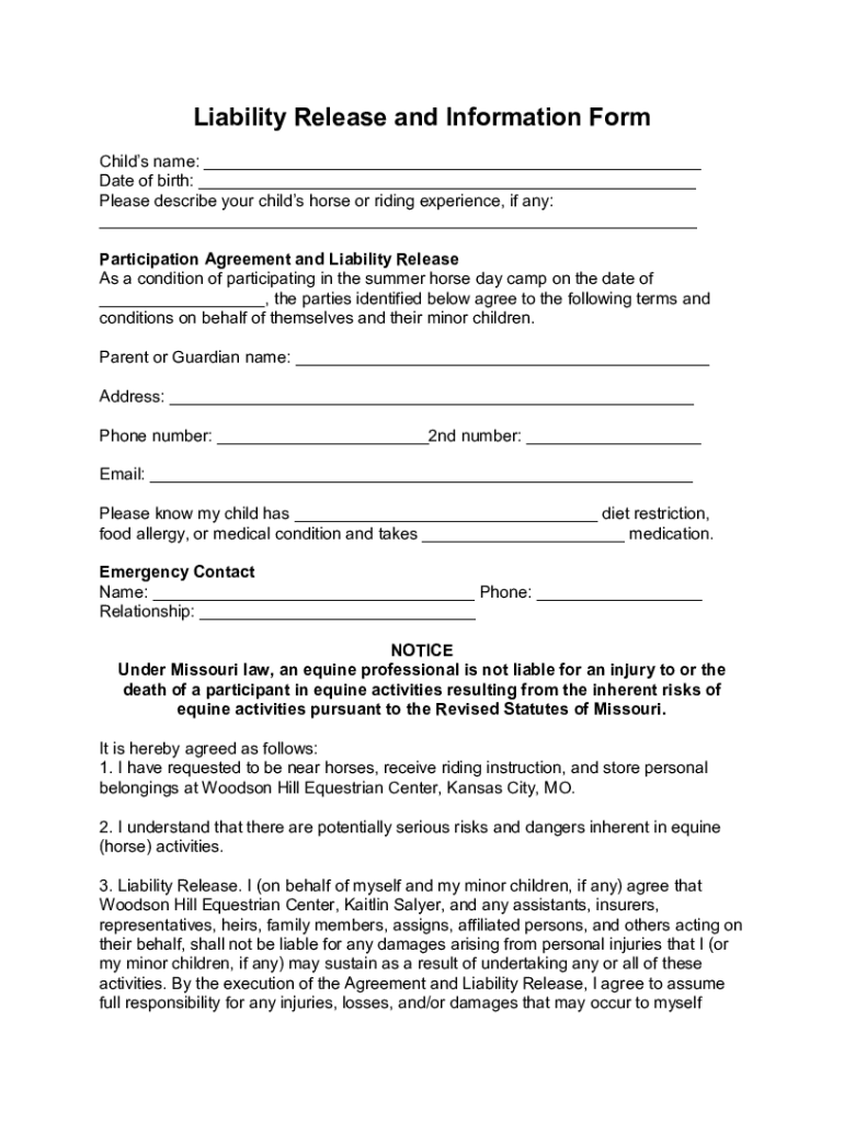Liability Release and Information Form Child's name: Date of birth: Please describe your children horse or riding experience, if any: Participation Agreement and Liability Release As a condition of