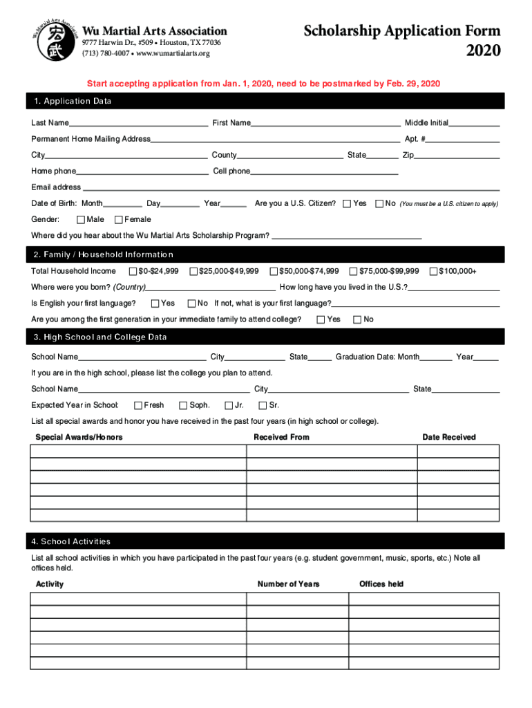 L A r ts A SSO CIO nu MtiaiatarScholarship Application Form Wu Martial Arts Association 9777 Darwin Dr., #509 Houston, TX 77036 (713) 7804007 www.wumartialarts.org2020Start accepting application from