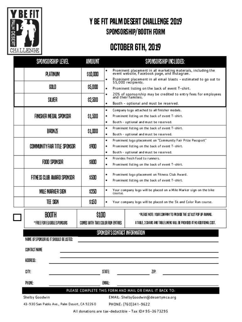 Y be fit palm desert challenge 2019 Sponsorship/booth form October 6th, 2019 Sponsorship levelAmountPlatinum$10,000Gold$5,000Silver$2,500Finisher medal sponsorSponsorship includes: Company logo attached