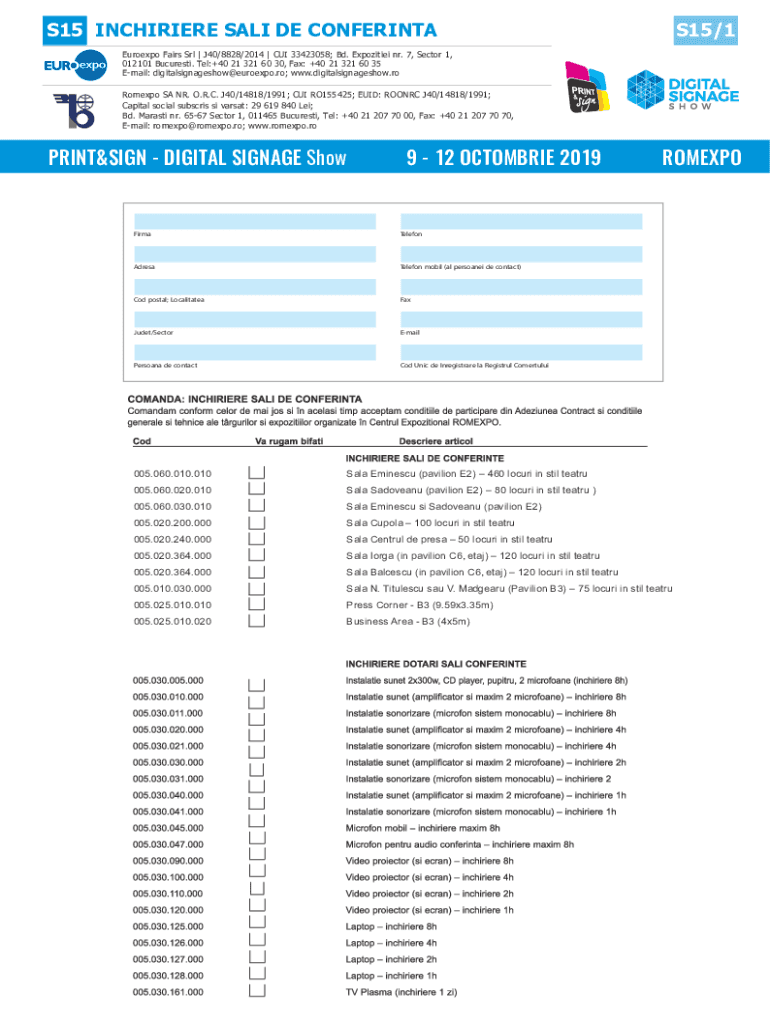 S15 INCHIRIERE SALE DE CONFERINTAS15/1Euroexpo Fairs NRL J40/8828/2014 CUT 33423058; BD. Exposition NR. 7, Sector 1, 012101 Bucharest. Tel:+40 21 321 60 30, Fax: +40 21 321 60 35 Email: digitalsignageshow