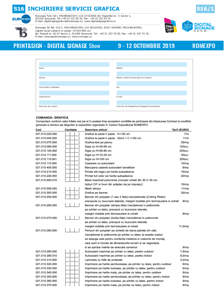 S16 INCHIRIERE SERVICE GRAFICAS16/1Euroexpo Fairs NRL J40/8828/2014 CUT 33423058; BD. Exposition NR. 7, Sector 1, 012101 Bucharest. Tel:+40 21 321 60 30, Fax: +40 21 321 60 35 Email: digitalsignageshow