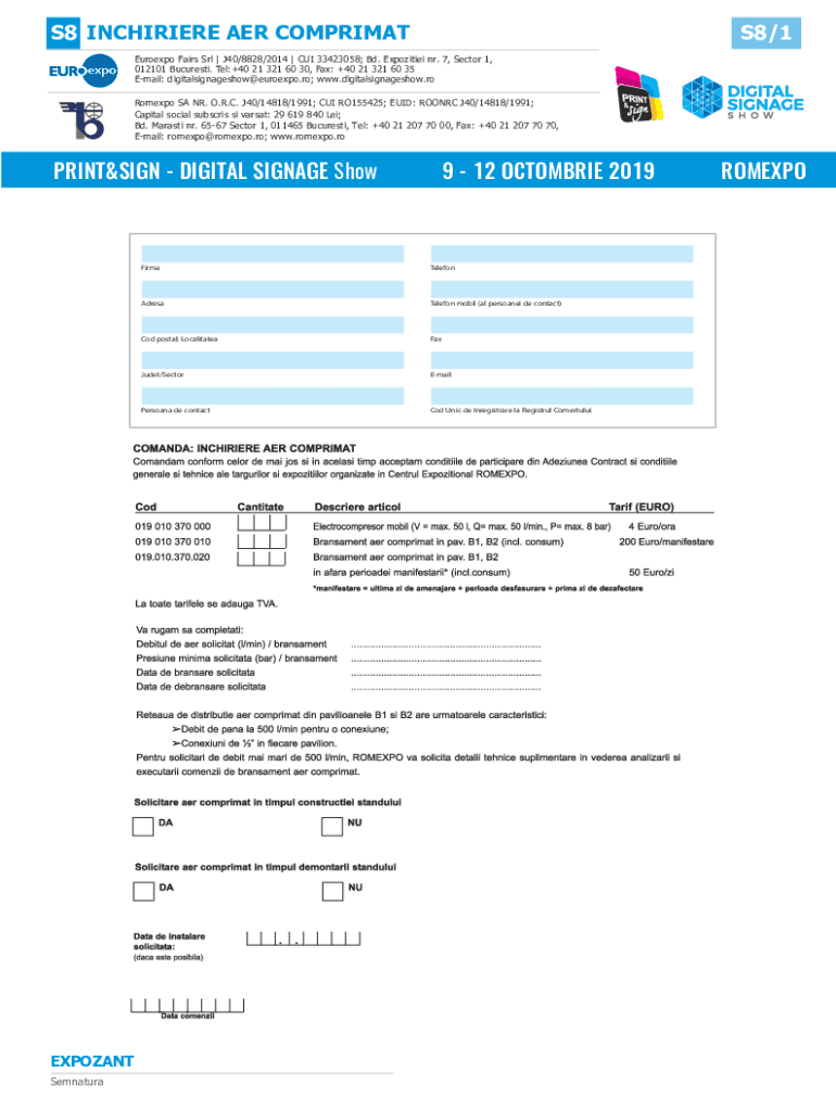 S8 INCHIRIERE AER COMPRIMATS8/1Euroexpo Fairs NRL J40/8828/2014 CUT 33423058; BD. Exposition NR. 7, Sector 1, 012101 Bucharest. Tel:+40 21 321 60 30, Fax: +40 21 321 60 35 Email: digitalsignageshow
