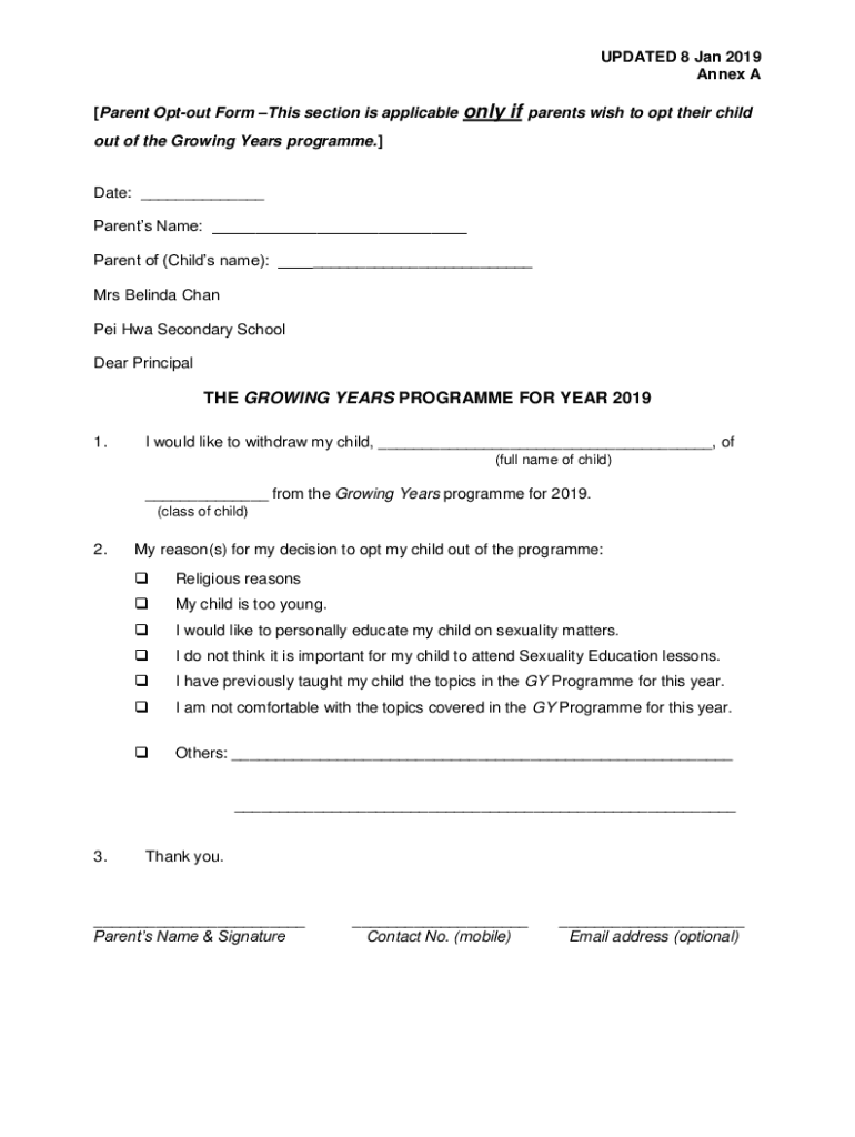 UPDATED 8 Jan 2019 Annex A Parent Op tout Form This section is applicable only if parents wish to opt their child out of the Growing Years program. Date: Parents Name: Parent of (Child's name): Mrs