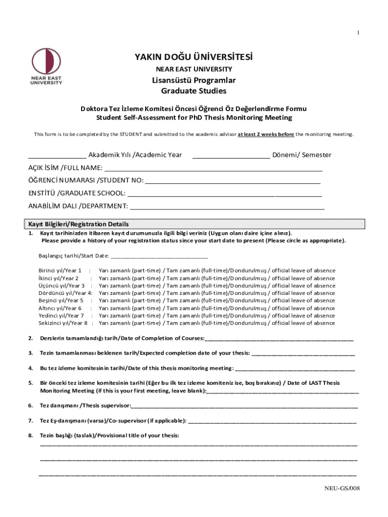 1YAKIN YOU Verse NEAR EAST UNIVERSITYLisansst Programmer Graduate Studies Doctor Ten theme Kites CESI French z Deerlendirme Form Student Reassessment for PhD Thesis Monitoring Meeting This form is