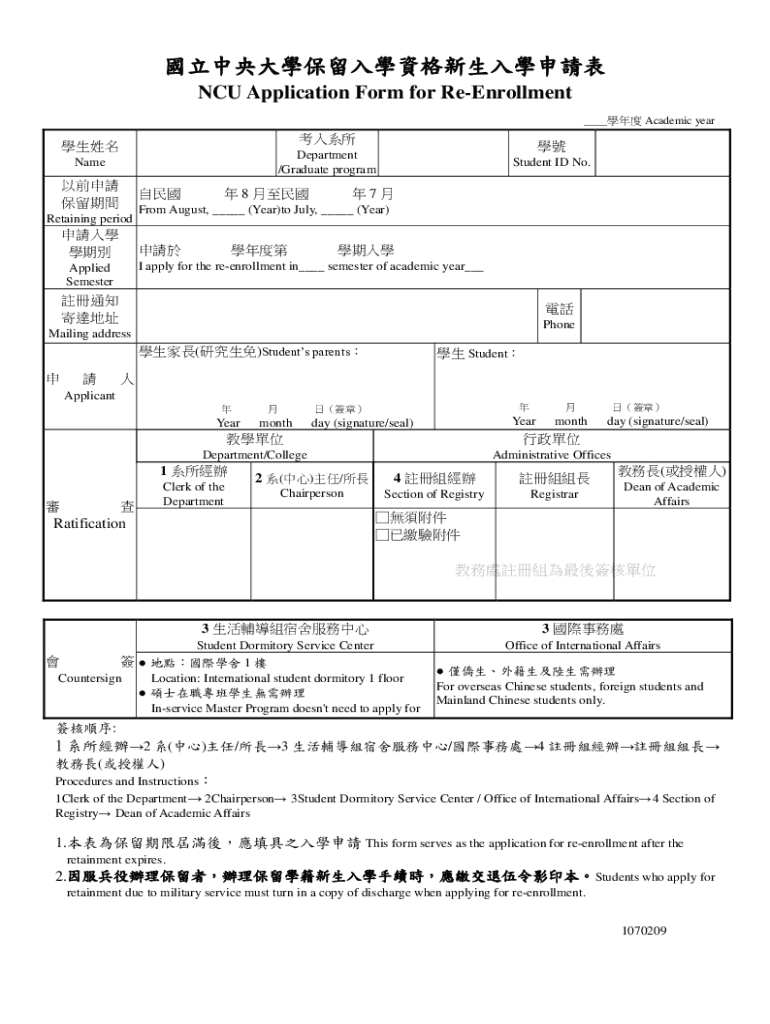 ICU Application Form for Enrollment Academic yearDepartment /Graduate programmed Retaining period 8 Student IDs No.7From August, (Year)to July, (Year)I apply for the reenrollment in semester of academic