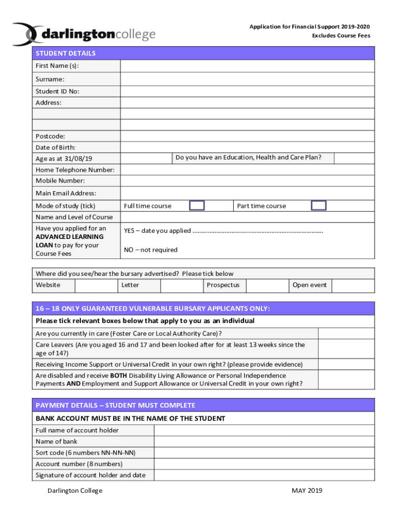Application for Financial Support 20192020 Excludes Course FeesSTUDENT DETAILS First Name (s): Surname: Student ID No: Address:Postcode: Date of Birth: Do you have an Education, Health and Care Plan?