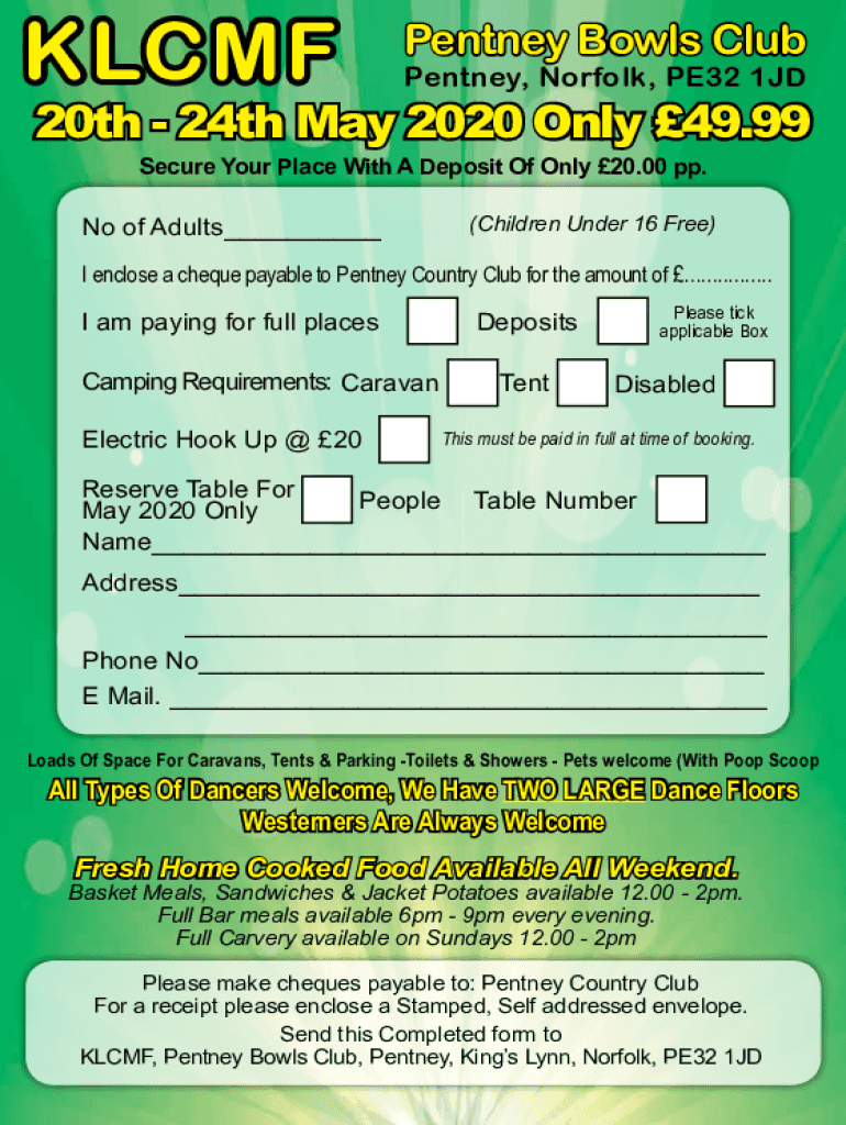KLCMFPentney Bowls Club Penney, Norfolk, PE32 1JD20th 24th May 2020 Only 49.99 Secure Your Place With A Deposit Of Only 20.00 pp. No of Adults (Children Under 16 Free)I enclose a check payable to