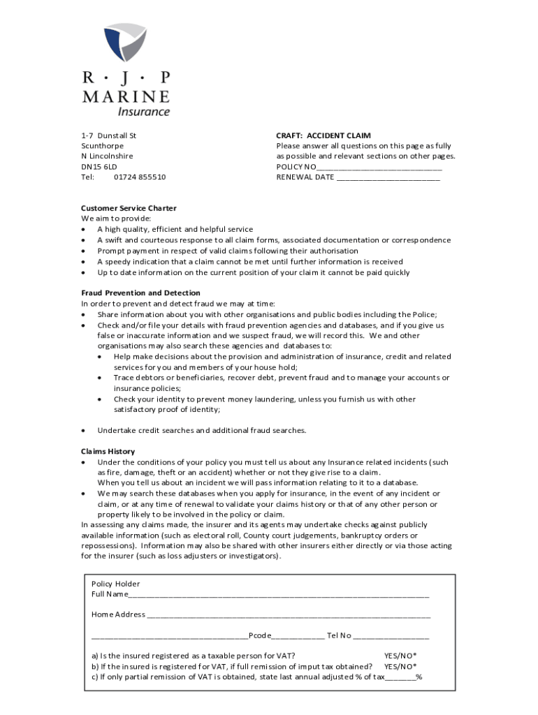 17 Don't stall St Scunthorpe N Lincolnshire DN15 6LD Tel: 01724 855510CRAFT: ACCIDENT CLAIM Please answer all questions on this page as fully as possible and relevant sections on other pages. POLICY