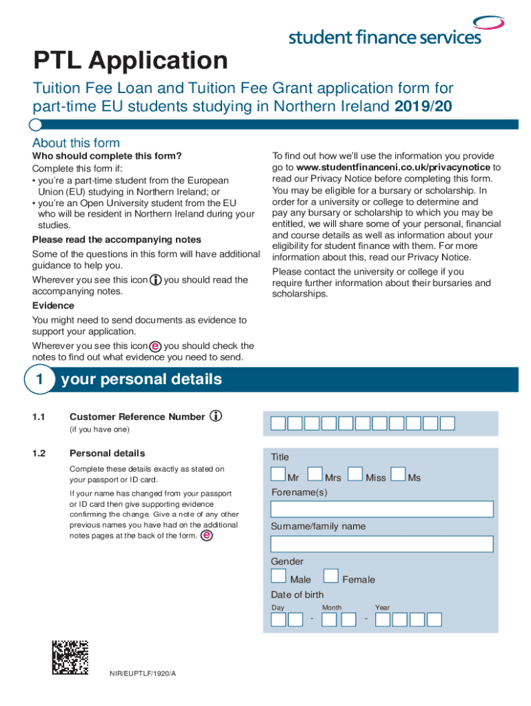PT Application Tuition Fee Loan and Tuition Fee Grant application form for part-time EU students studying in Northern Ireland 2019/20 About this form Who should complete this form? Complete this form