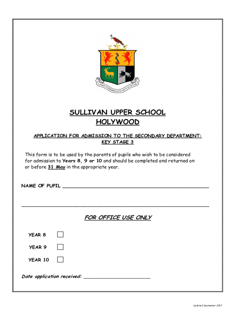 SULLIVAN UPPER SCHOOL HOLLYWOOD APPLICATION FOR ADMISSION TO THE SECONDARY DEPARTMENT: KEY STAGE 3 This form is to be used by the parents of pupils who wish to be considered for admission to Years