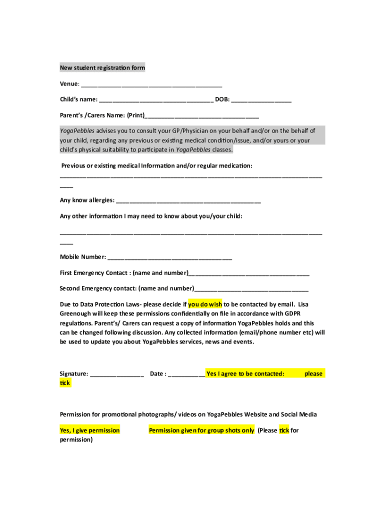 New student registry. On revenue: Child's name: DOB: Parents /Carers Name: (Print) YogaPebbles advises you to consult your GP/Physician on your behalf and/or on the behalf of your child, regarding