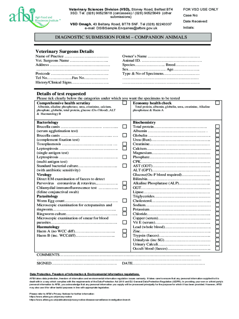 Veterinary Sciences Division (VSD), Stone Road, Belfast BT4 3SD. Tel: (028) 90525618 (carcasses) / (028) 90525649 (other submissions) VSD Ref. No VSD Olaf, 43 Beltane Road, BT78 5NF. Tel (028) 82243337