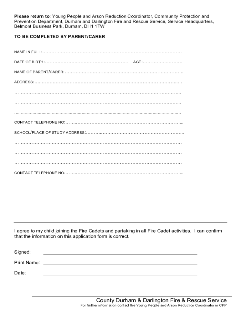 FIRE CADETS APPLICATION Backcountry Durham & Darlington Fire & Rescue ServiceNow further information contact the Young People and Arson Reduction Coordinator in COUNTY DURHAM AND DARLINGTON YOUNG