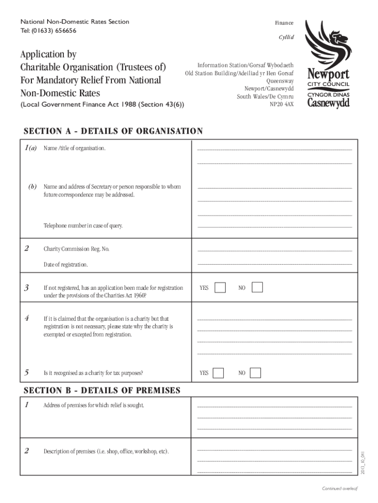 National Domestic Rates Section Tel: (01633) 656656Finance CyllidApplication by Charitable Organization (Trustees of) For Mandatory Relief From National Domestic RatesInformation Station/Dorsal Wybodaeth